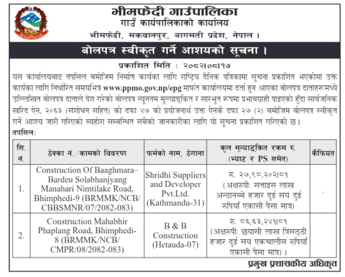 » बोलपत्र स्वीकृत गर्ने आशयको सूचना।।।
