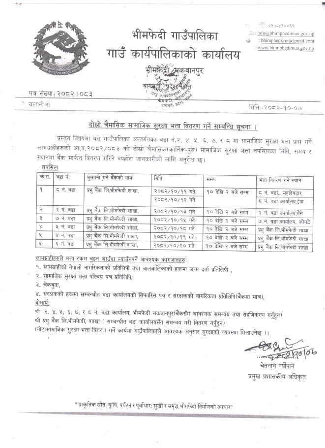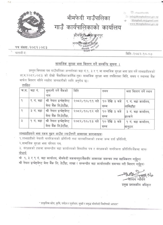 दोस्रो त्रैमासिक सामाजिक सुरक्षा भत्ता वितरण गर्ने सम्बन्धी सूचना।।। सामाजिक सुरक्षा भत्ता वितरण हुने दिनको तालिका ।।।