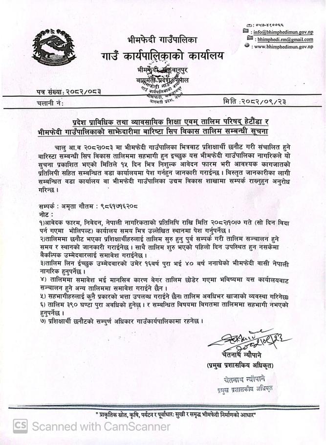 » प्रदेश प्राविधिक तथा व्यावसायिक शिक्षा एवम् तालिम परिषद हेटौडा र भीमफेदी गाउँपालिकाको साझेदारीमा बारिष्टा सिप विकास तालिम सम्बन्धी सूचना।।।