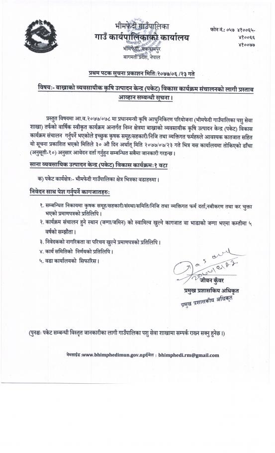 » बाख्राको व्यवसायीक कृषि उत्पादन केन्द्र (पकेट) विकास कार्यक्रम संचालनको लागि प्रस्ताब आव्हान सम्बन्धी सूचना।।।