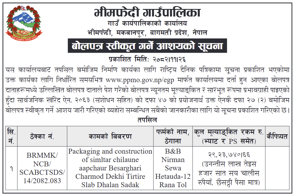 » बोलपत्र स्वीकृत गर्ने आशयको सूचना।।।