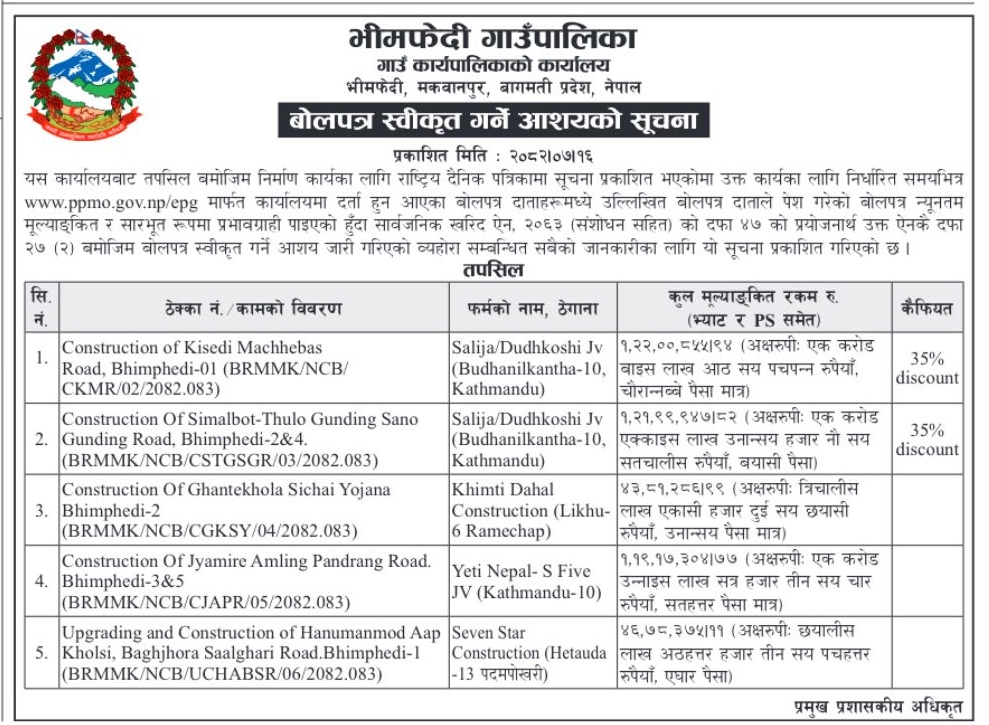 » बोलपत्र स्वीकृत गर्ने आशयको सूचना।।।
